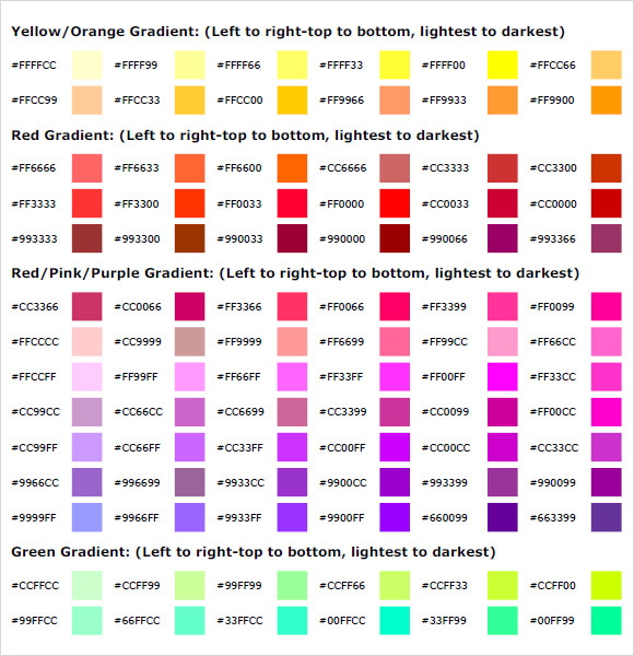 The following two color code charts can be used as a reference when applying colors to an html document.